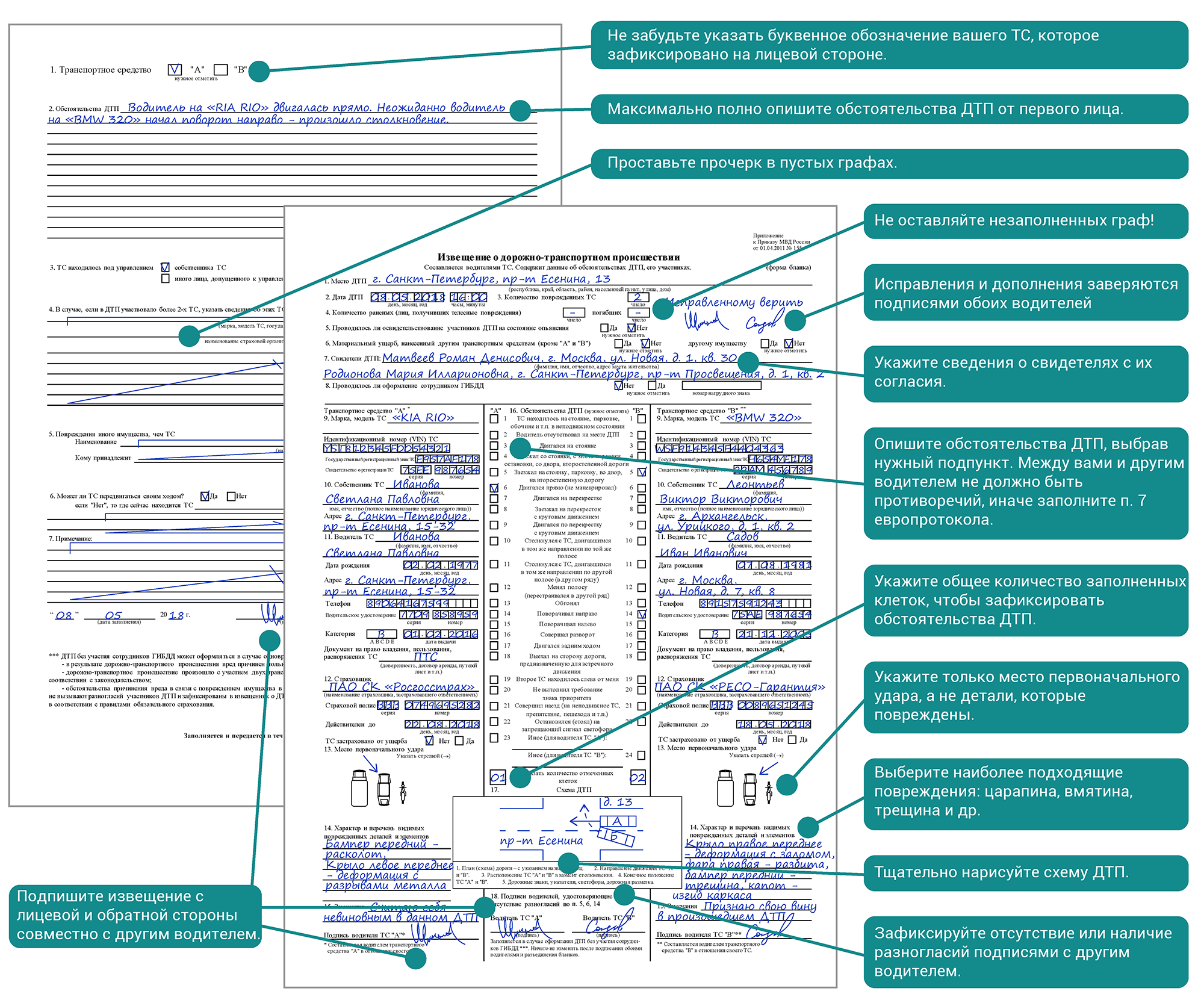 | Номер страхового полиса, водительского удостоверения или VIN автомобиля написан с ошибкой (п. 9, 10, 11 европротокола). | Данные о страховом полисе, водительском удостоверении и VIN номере автомобиля указаны в соответствии с документами. |