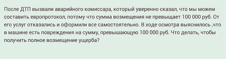 Необходимо обратиться к виновнику аварии и взыскать с него недостающую сумму. Закон не предусматривает ответственность аварийных комиссаров и других лиц, в присутствии которых оформляются документы о ДТП*.