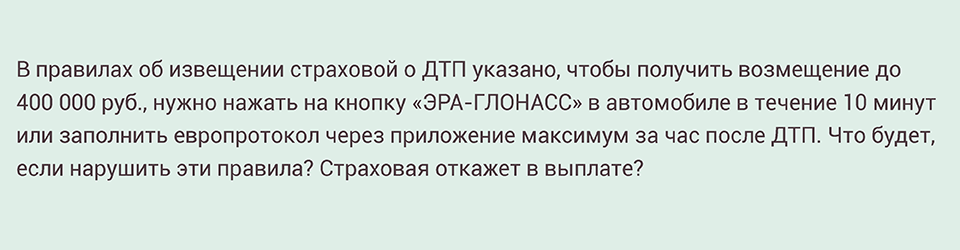 Если у страховщика не будет сведений о ДТП, полученных через ГЛОНАСС или мобильное приложение, то он все равно выплатит страховое возмещение. Но его сумма не превысит 100 000 руб.