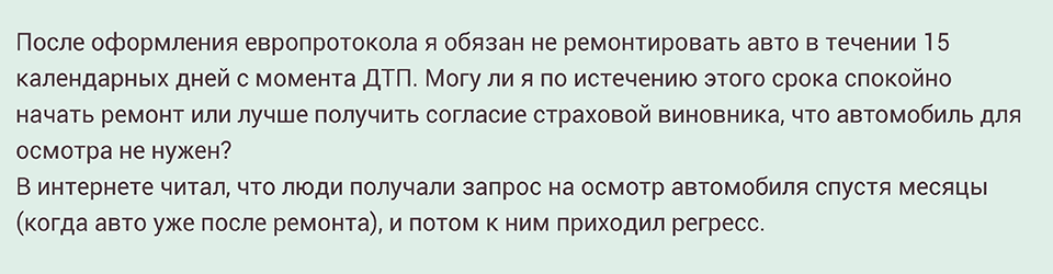 Чтобы начать ремонт до истечения 15 календарных дней со дня аварии, за исключением нерабочих праздничных дней, то для этого нужно согласие обоих компаний, застраховавших ответственность участников ДТП.