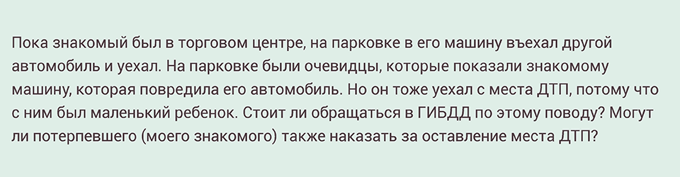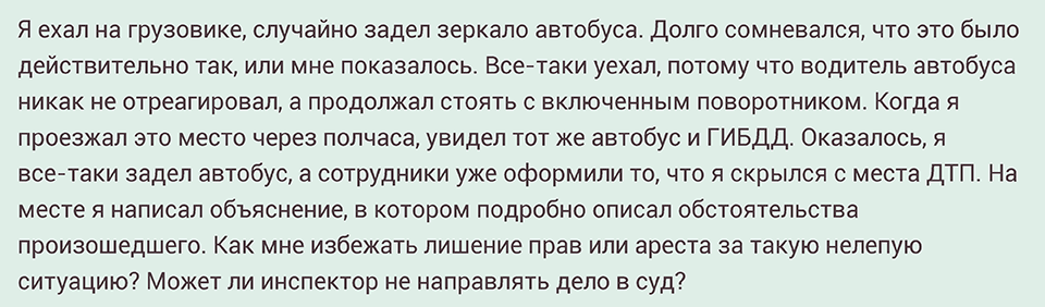 С одной стороны, он не остановился, не осмотрел повреждения и место ДТП, не связался с другим участником аварии и не вызвал ГИБДД, то есть формально оставил место ДТП. Но с другой стороны, водитель сделал это неумышленно, потому оснований для привлечения его к ответственности за оставление места ДТП не будет.