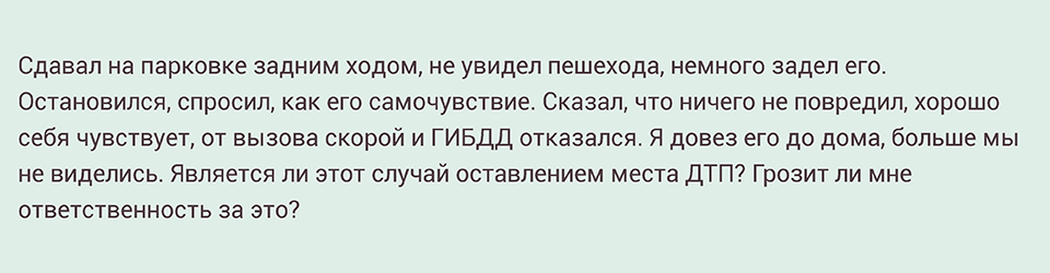 Если в результате соприкосновения с пешеходом не произошло его ранения или причинения ему материального ущерба, то описанный случай не является оставлением места ДТП, потому что в соответствии с ПДД под ДТП понимается событие, возникшее в процессе движения по дороге транспортного средства и с его участием, при котором погибли или ранены люди, повреждены транспортные средства, сооружения, грузы либо причинен иной материальный ущерб. В то же время, во избежание возможных ложных обвинений со стороны пешехода целесообразно попросить его подтвердить в письменном виде, что он не получил какого-либо вреда в результате описанных событий, либо зафиксировать его слова с помощью видео- или аудиозаписи*.