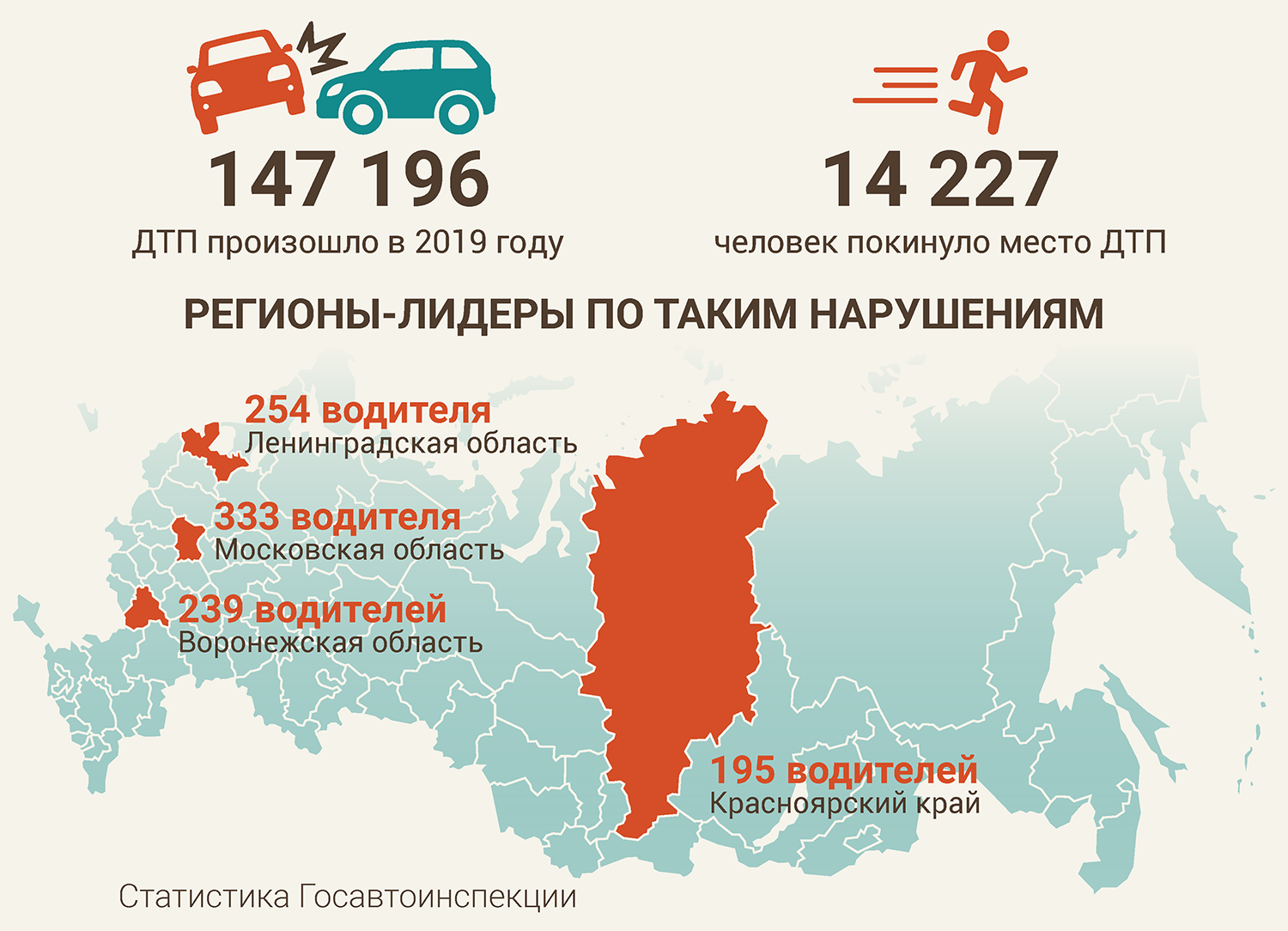 Кроме того, статистика Госавтоинспекции указывает, что в 2019 году произошло 147 198 ДТП, из них место ДТП покинуло 14 227 человека. При этом лидерами по таким нарушениям стали Московская область (333 водителя, скрывшихся с места аварии), Ленинградская область (254 уехавших с места ДТП), Воронежская область (239 нарушителей), Красноярский край (195 участников ДТП).