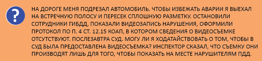 Юрист Европейской юридической службы Дмитрий Безделин говорит, что хотя выезд на встречную полосу является грубым нарушением ПДД, но такой маневр разрешен при крайней необходимости, например, для предотвращения аварии. Если автомобилист смотрел видеозапись, но в материалах дела её нет, то водитель может ходатайствовать перед судом о её приобщении. "Это требование рассматривается незамедлительно, а при отказе суд выносит определение" - добавляет эксперт.