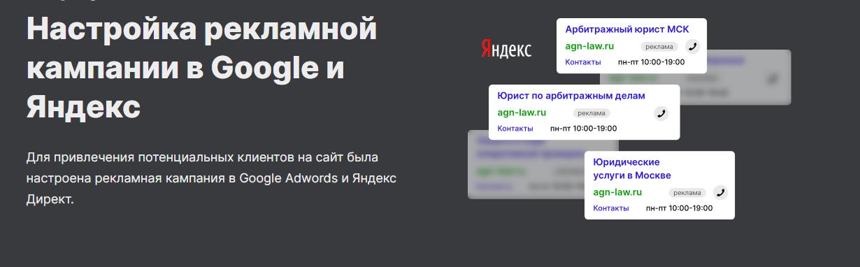 - Одной из целей маркетинговой кампании юридической фирмы была выработка альтернативных инструментов юридического маркетинга, которые позволят привлекать клиентов, когда сарафанное радио затихает. Для этого «Лаборатория юрмаркетинга» настроила рекламные кампании в «Яндексе» и Google.