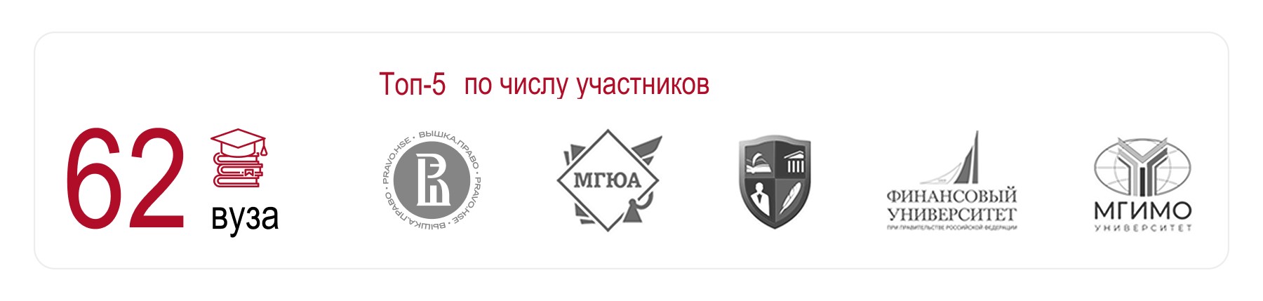 При этом по количеству участников среди вузов лидируют НИУ ВШЭ, МГЮА имени О. Е. Кутафина, Финансовый университет при Правительстве РФ, ИЦЧП (РШЧП) и МГИМО.