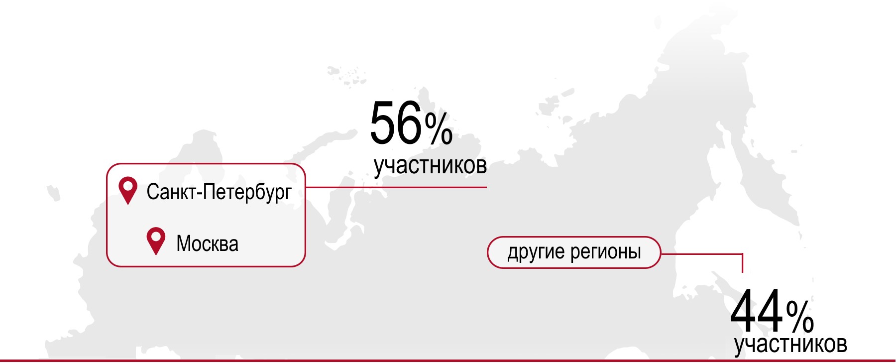 Участие в конкурсе приняли учащиеся 62 вузов России. В лидерах оказались Москва и Санкт-Петербург: на их долю пришлось 56% участников, в то время как на другие регионы пришлось 44%.