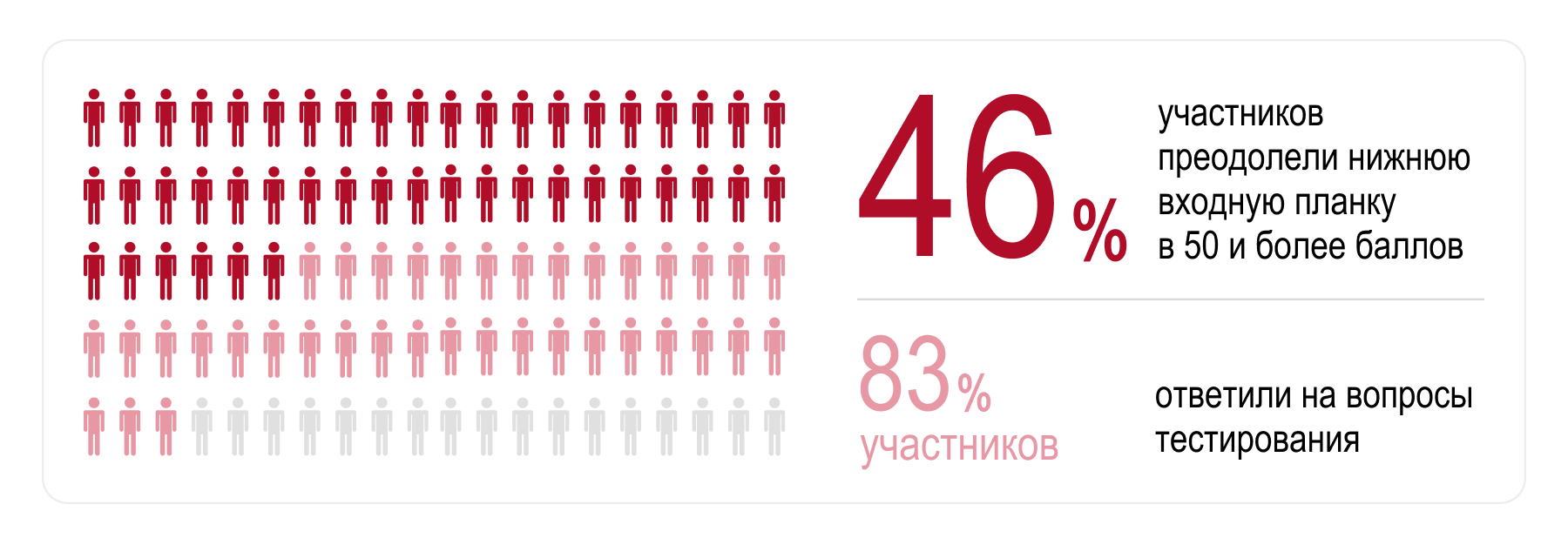 Ответить на вопросы тестирования удалось 83% участников, но лишь 46% из них смогли преодолеть нижнюю входную планку в 50 и более баллов (работы с результатом менее 50 баллов не рассматривались в качестве претендентов на победу).