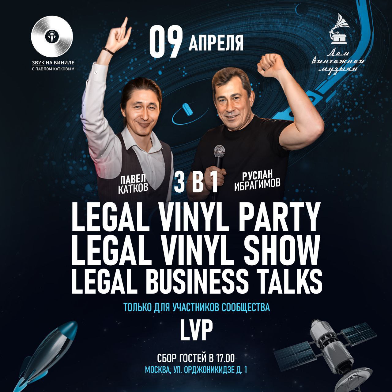 Legal Vinyl Party создана в 2019 году Русланом Ибрагимовым (МТС, АНО «Цифровая экономика», IRS Group) и Павлом Катковым («Система Масс-медиа», Katkov.School, Future Legal) после встречи на виниловом шоу «Звук на виниле» в Клубе Алексея Козлова, джаз-клубе № 1 в мире в рейтинге All About Jazz.