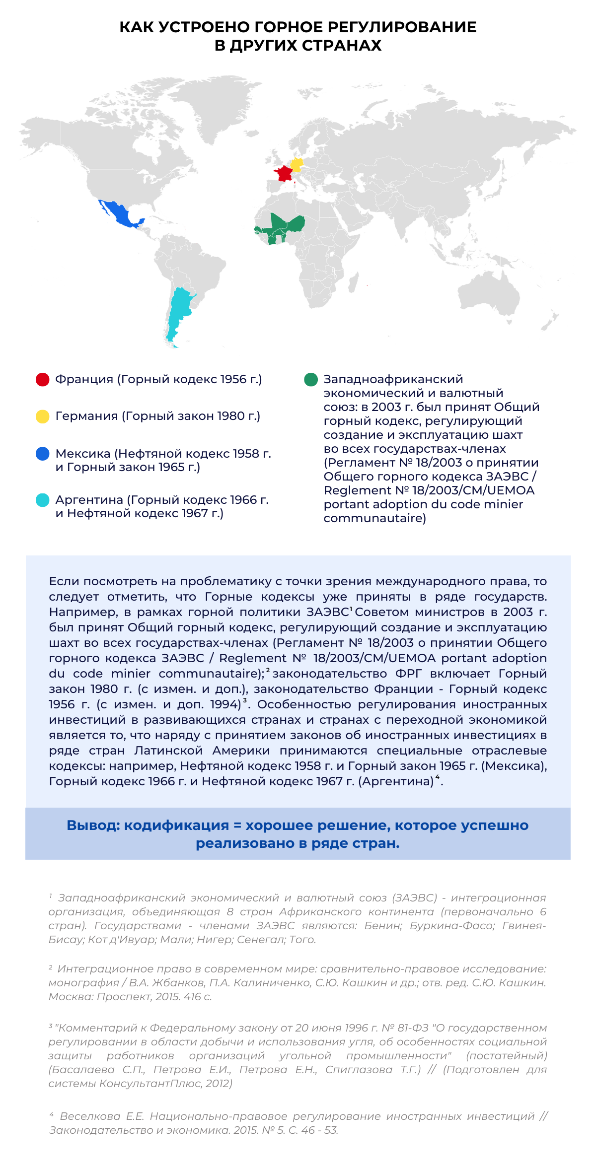 Для усовершенствования российской законодательной базы использования недр необходимо настаивать на кардинальных изменениях в горном законодательстве РФ, на совершенствовании нормативной базы и принятии Горного кодекса, содержащего все необходимые нормы для эффективного использования недр в России. Кодекс должен объединить нормы конституционного, гражданского, административного, налогового, финансового и трудового прав, а также природоохранного и экологического права, устанавливая положения об экологической ответственности недропользователей. Особое внимание следует уделить условиям ограничения, временного приостановления и прекращения права пользования недрами. Вопрос о необходимости принятия Горного кодекса стоит уже давно. Несмотря на наличие разработанного проекта и законодательной базы, до сих пор отсутствует федеральное ведомство, готовое принять на себя ответственность за разработку Горного кодекса, который будет способствовать обеспечению стратегической и экологической безопасности стран.