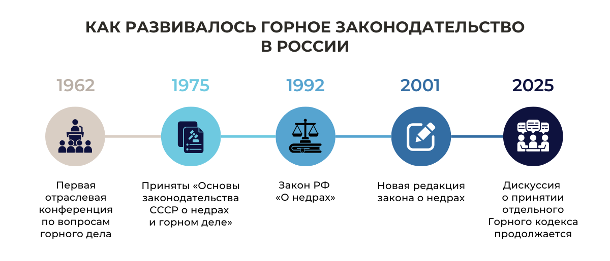 Попытки создать единый Горный кодекс предпринимались с середины 1990-х годов. Но ни одна инициатива не дошла до финала. В 1995-м проект обсуждался в Госдуме, но был отклонен. В 2000-е идея вернулась, но застопорилась в министерских кабинетах. В 2017 году вновь заговорили о необходимости кодификации, однако документ так и не был внесён на рассмотрение парламента. Последние попытки — в 2022 и 2024 годах — также не увенчались успехом.