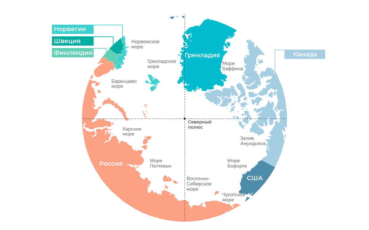 До принятия Конвенции 1982 г. арктические государства придерживались «секторального принципа», в относительной степени прослеживаемого в современном законодательстве Канады. Согласно этому принципу, Арктика, включая акваторию Северного Ледовитого океана, северной части Атлантического и Тихого океанов, поделена на «секторы» или «части» с центром на Северном полюсе. Самый большой «кусок пирога» достался России как крупнейшему арктическому государству.