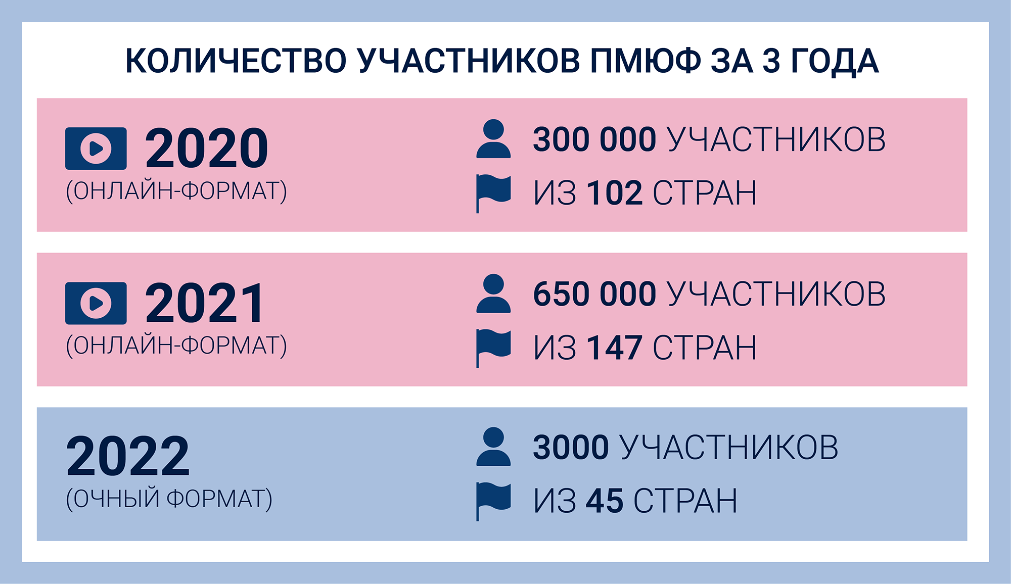 Юбилейный ПМЮФ в 2022 году прошел в очном режиме. В 2023-м мероприятие тоже пройдет офлайн, и ожидается, что в этом году число участников составит свыше 4000. Пять лет назад форум посетило 4500 человек, а в 2019 году — 5000.