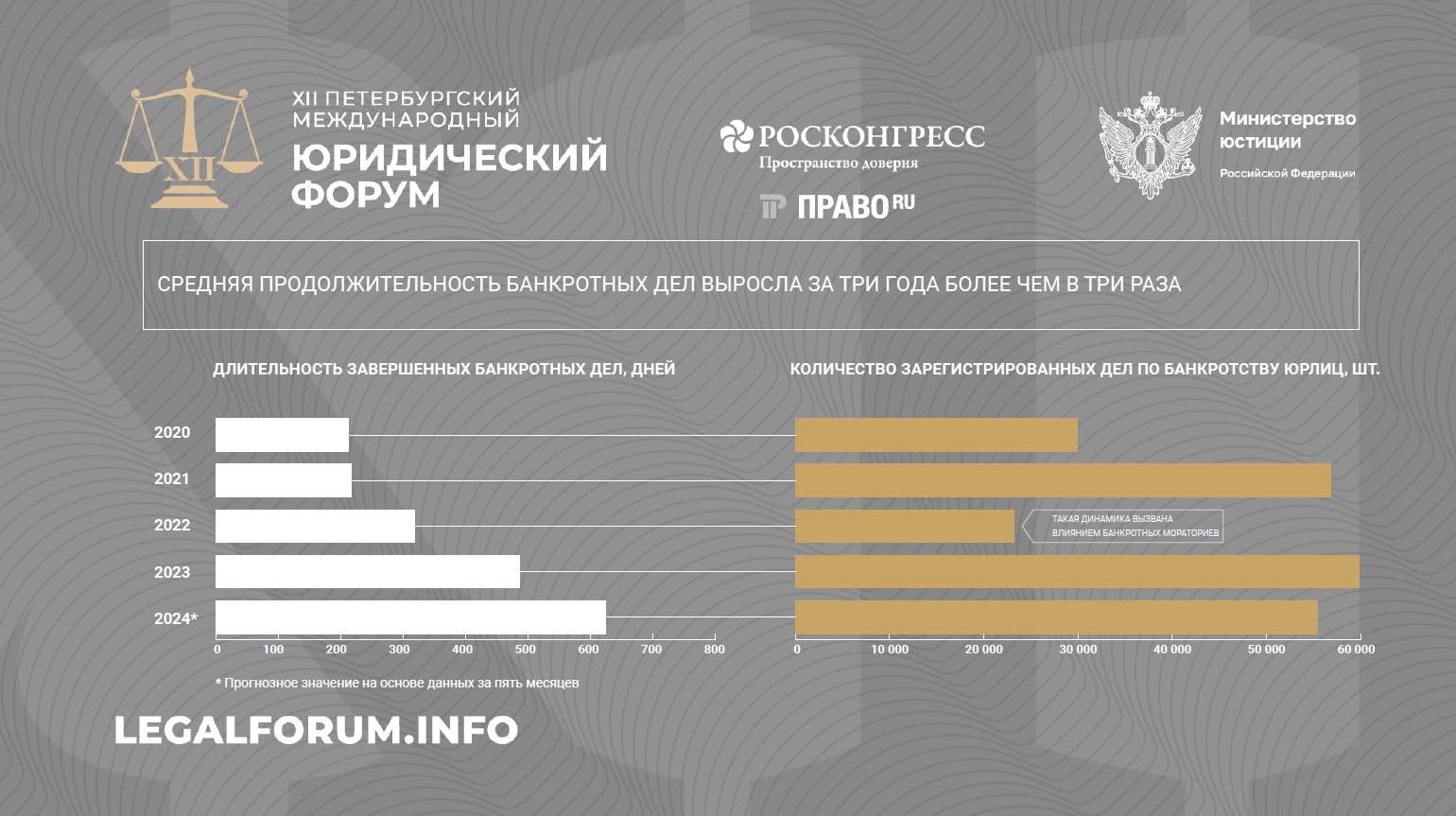 Регулярно на ПМЮФ команда Право.ru презентует свое исследование экономических споров. Динамика рассмотрения этих дел судами ярко показывает истинное состояние делового климата в стране, подчеркнул главный редактор издания Борис Болтянский. «Наш анализ объективен, так как строится исключительно на big data — больших данных», — пояснил он. Как выяснили аналитики Право.ru, нагрузка на судебную систему в РФ за последний год значительно выросла и вернулась к доковидному уровню. Более того, средняя продолжительность банкротного дела с 2020 года увеличилась более чем в три раза.