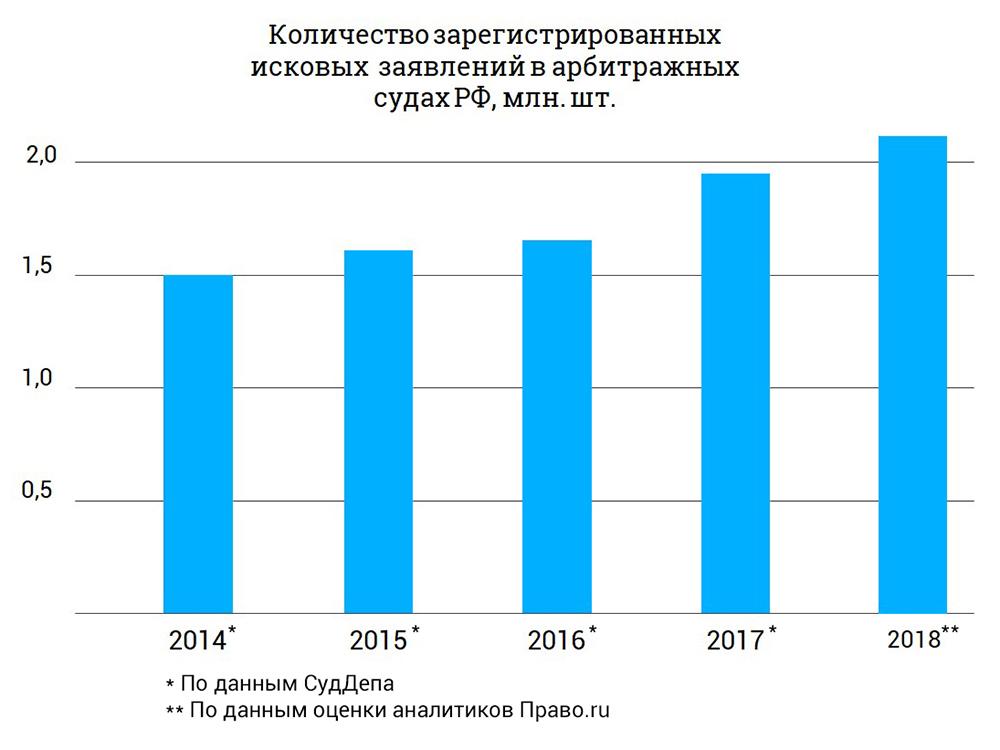 Аналитики «Право.ru», используя систему для юристов Casebook, посчитали, что ежегодный объём регистрируемых исков в арбитражах России превысил 2 млн и с каждым годом их число увеличивается на 10%. Так, в 2017-м рост составил 13%, а по итогам 2018-го ожидается на уровне 16% (по информации Суддепа при ВС). Также судиться в России выгоднее и быстрее, чем в большинстве стран ЕС и Центральной Азии.