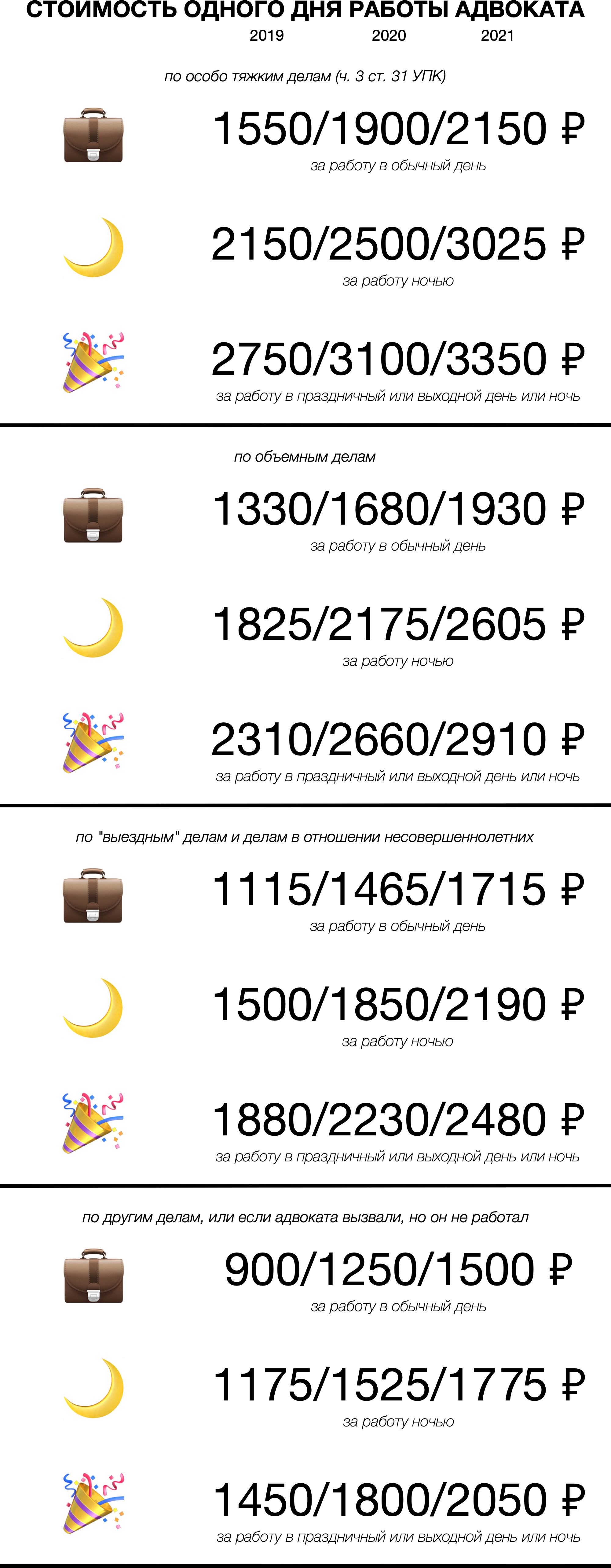 В конце мая 2019 года стало известно, что адвокаты по назначению смогут рассчитывать на фиксированные ставки в ближайшие три года. Их сумма будет варьироваться от сложности уголовного дела, времени суток и дня недели. Так, теперь при назначении ставок будут учитывать подсудность уголовного дела. Например, за участие в делах, которые рассматриваются в краевом, областном судах или в городах федерального значения будут платить больше. Также повлияет на сумму количество подозреваемых или обвиняемых, число предъявленных обвинений, объем материалов дела. Вознаграждение будет зависеть от времени суток и дня недели. За работу в ночное время или выходной день предусмотрены увеличенные выплаты. А в случае осуществления полномочий адвокатом хотя бы частично в ночное время размер его вознаграждения рассчитают за данный день по «ночному тарифу». Такой порядок выплат утвердили в Постановлении Правительства «О внесении изменений в Положение о возмещении процессуальных издержек, связанных с производством по уголовному делу, издержек в связи с рассмотрением дела арбитражным судом, гражданского дела, административного дела, а также расходов в связи с выполнением требований Конституционного Суда РФ». Действие новых правил распространяется на услуги, оказанные с 1 января 2019 года, а уже выплаченные вознаграждения за этот период пересчитают.