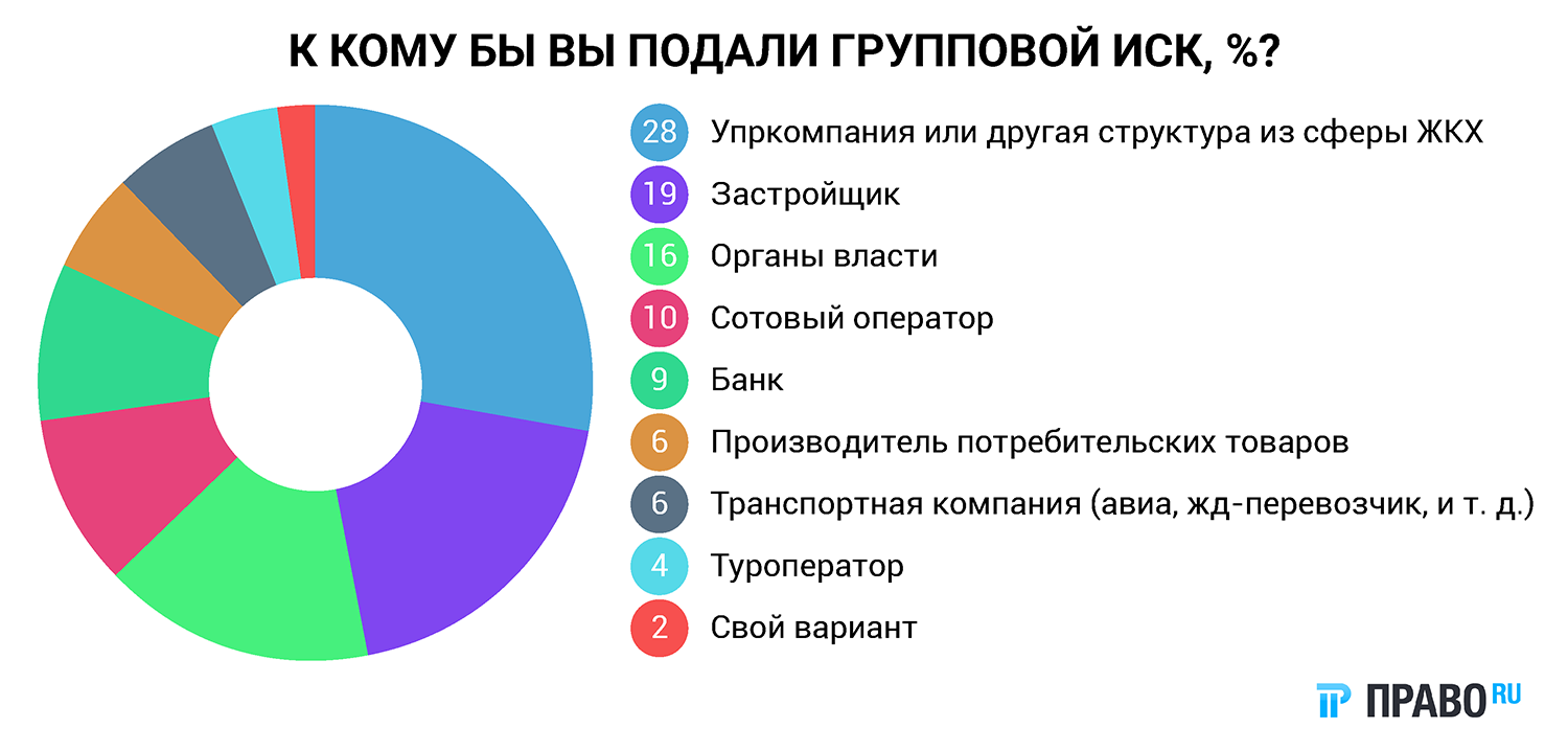 Опрос проводился среди читателей с 25 сентября по 2 октября. Первыми бы получили иск управляющие компании и другие структуры из сферы ЖКХ, считают 28% проголосовавших. Второе место у застройщиков: вопросы обманутых дольщиков подходят под формат коллективных исков. Органы власти также с большим отрывом входят в первую тройку.