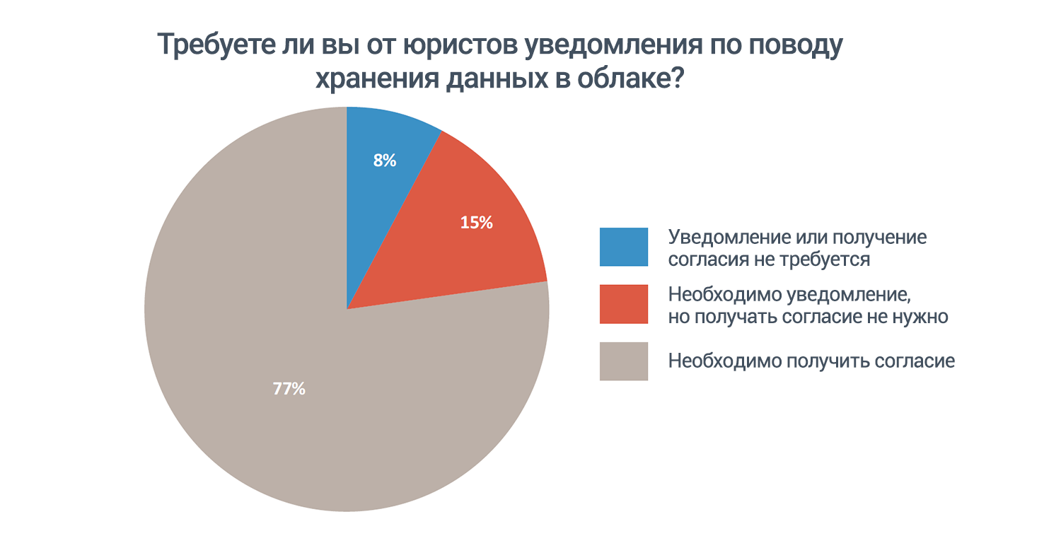 Как показал новый опрос, проведенный CLOC и фирмой Fish & Richardson, компании хотят, чтобы юрфирмы запрашивали разрешения перед перемещением данных в облако. Тем не менее напрямую такие требования выдвигают редко, а до предложений ещё не дошли сами юридические компании.