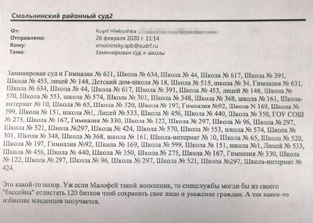 Угрозы минирования поступили также в суды Петербурга. Из-за них эвакуировали девять районных судов: Смольнинский, Дзержинский, Приморский, Василеостровский, Петроградский, Октябрьский, Ленинский, Петродворцовый, Красногвардейский. Об этом сообщила объединенная пресс-служба судов города, опубликовав фотографию анонимного сообщения. В e-mail также говорится, что заминированы несколько десятков школ Петербурга.
