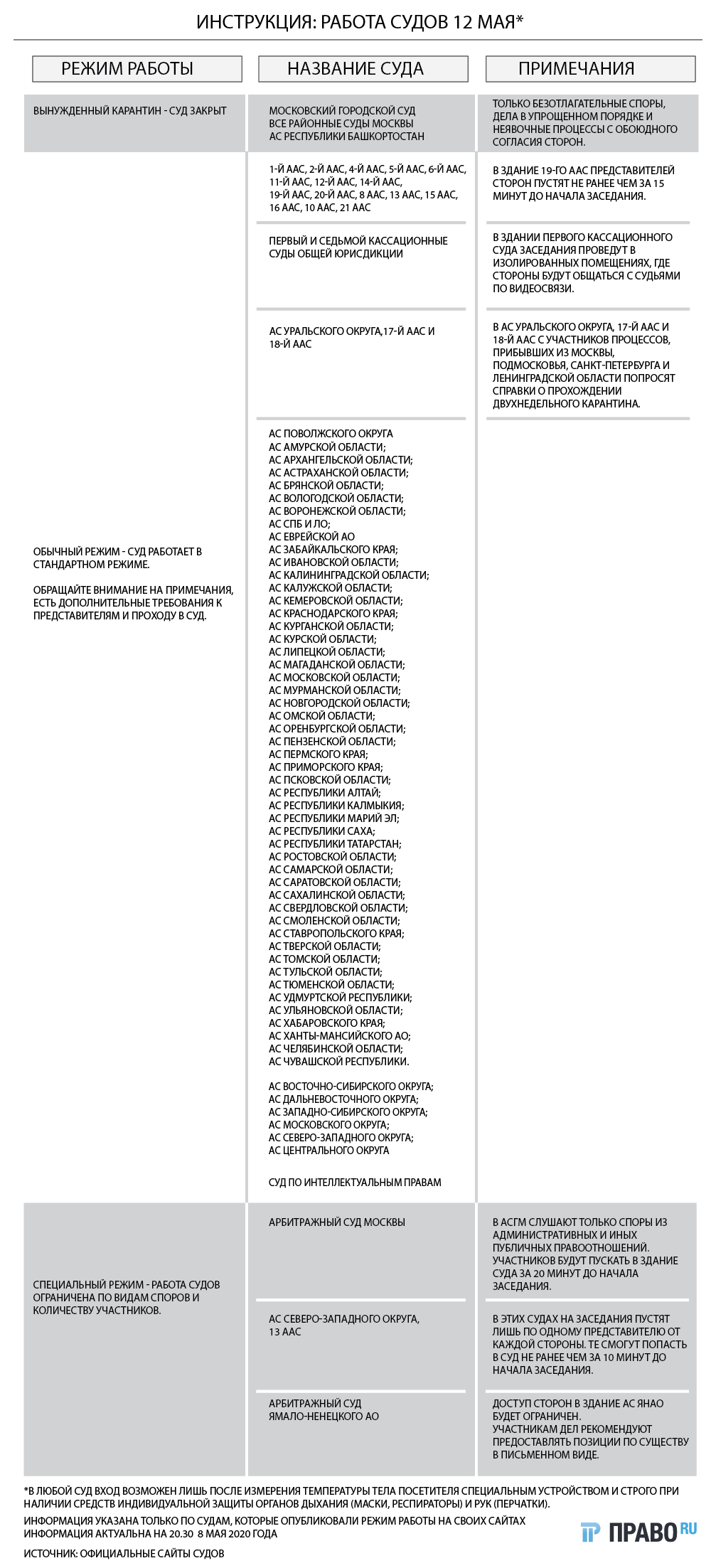 С 12 мая суды постепенно будут выходить из карантина и начинать свою работу. Кто-то уже со вторника станет функционировать в обычном формате, но многие выбрали себе специальный режим. А московские СОЮ остаются пока закрытыми до 31 мая 2020 года. Чтобы не запутаться, как попасть во вторник в суд на свой процесс, сделали для вас табличку в графиком работы судов.