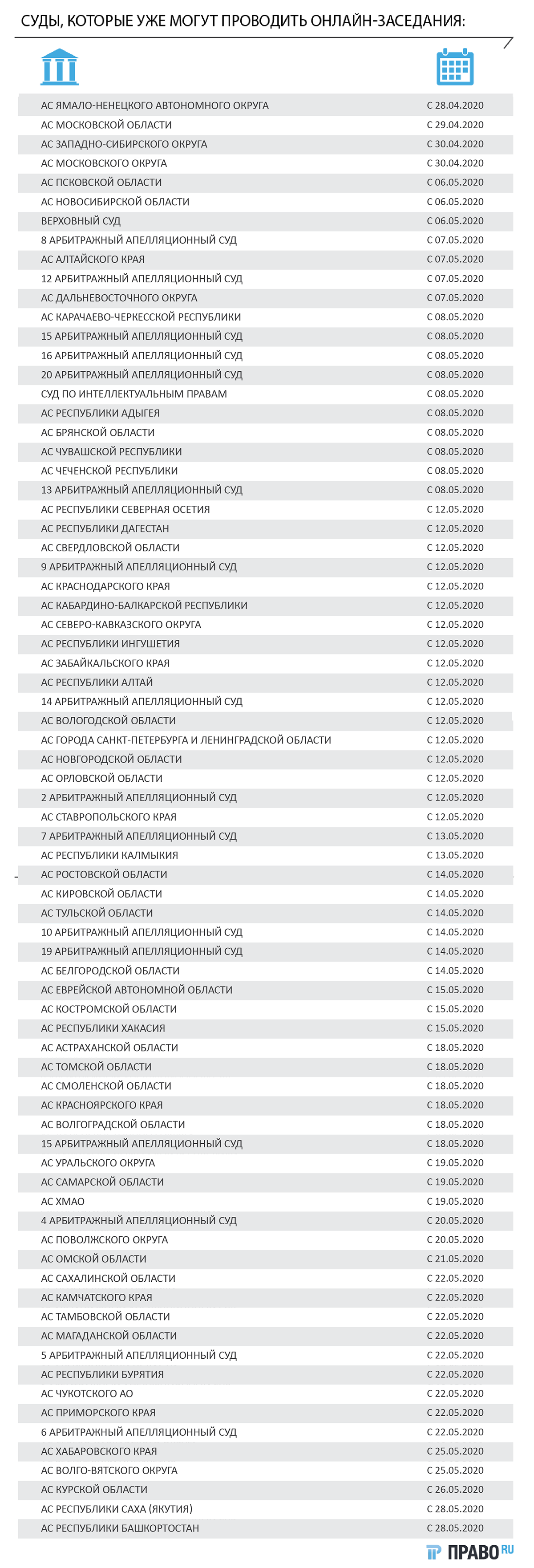 В четверг, 28 мая, о готовности проводить онлайн-заседания объявили Арбитражные суды Республики Саха (Якутия) и Республики Башкортостан. Всего на сегодня видеоконференцсвязь при рассмотрении арбитражных дел используют уже в 77 судах.