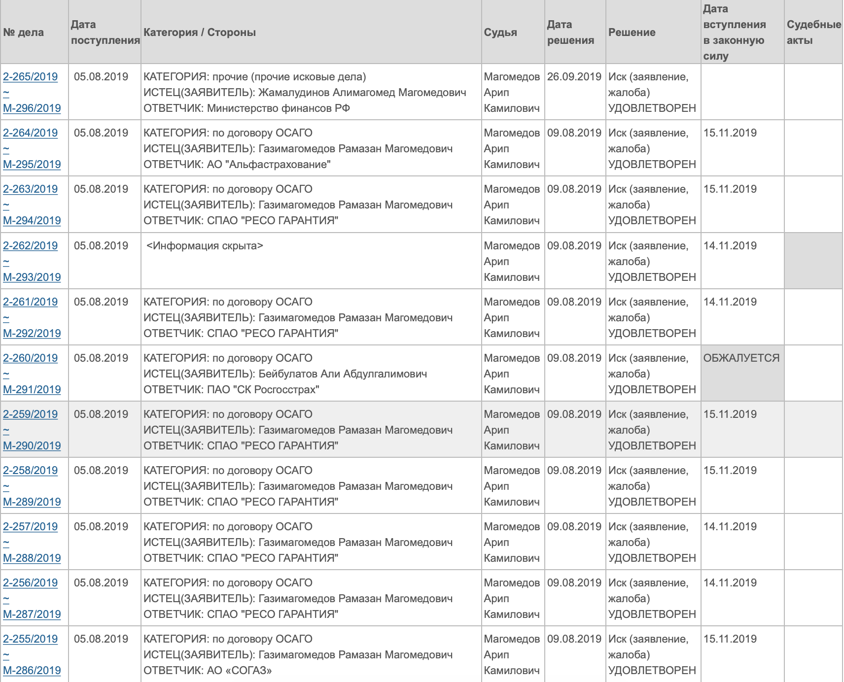 В июне 2019 года ККС Дагестана приняла решение, что в скором времени Магомедов уйдет в отставку. А незадолго до своего последнего рабочего дня судья рассмотрел десяток исков к разным страховым компаниям на 43 млн руб. Сделал он это в рекордные сроки. На каждое из дел у него ушло всего по четыре дня. Кроме того, решения по всем искам были приняты в один день, 9 августа. Все требования граждан-истцов Магомедов удовлетворил.