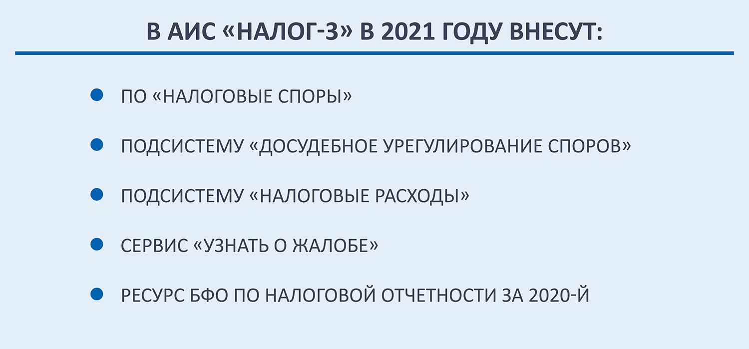 На 2021 год также намечена разработка концепции для информационной системы «Налог-4». Одновременно ФНС будет внедрять в эксплуатацию ПО системы предыдущего поколения «Налог-3» и развивать его функционал для бухгалтерской отчетности. Основные работы по запуску «Налог-3» завершились в 2019 году.