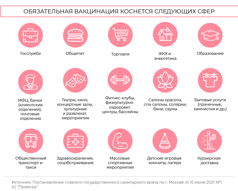 15 июня санврач постановила, что обязательная вакцинация распространяется на работающих в торговле, сферах красоты и здоровья, бытовых услуг, клиентских офисах банков и почтовых отделениях, в такси, образовании, здравоохранении и соцзащите, ЖКХ, в сферах культуры и досуга, детских учреждениях.