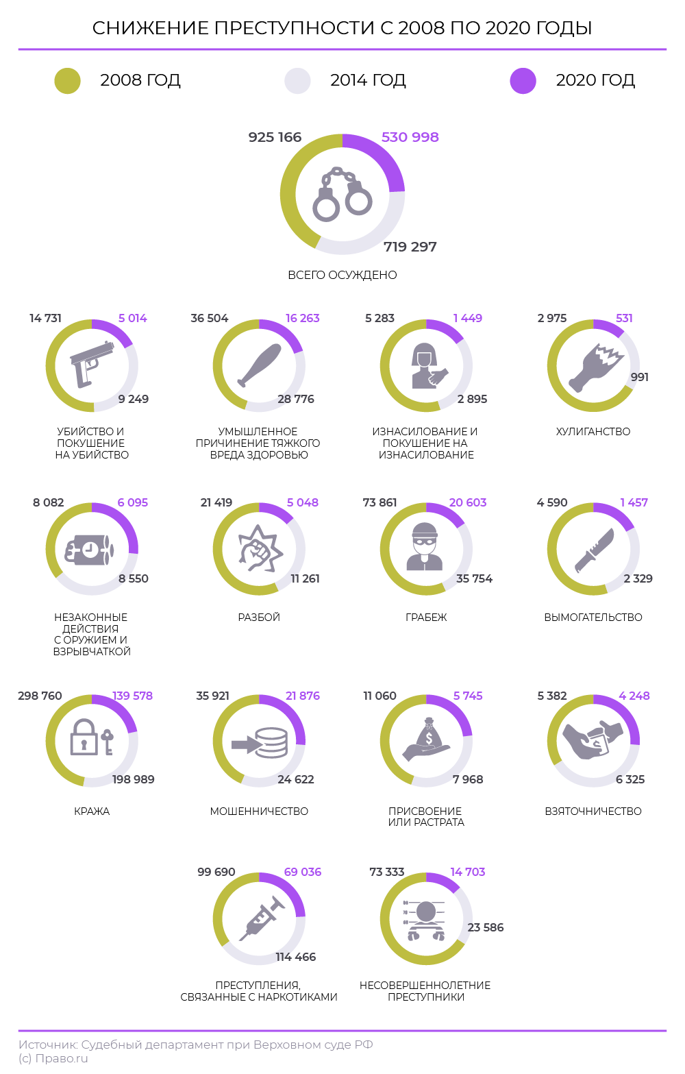 В инфографике – число преступлений в 2008, 2014 и 2020 годах.