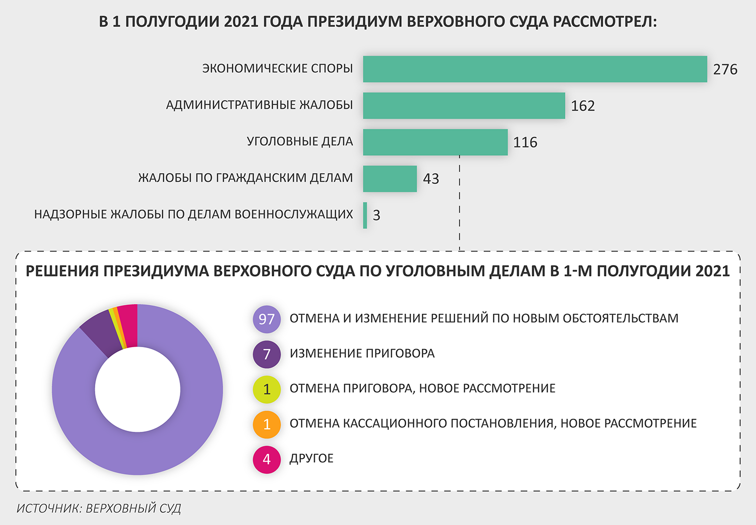 Верховный Суд опубликовал статистику решений Президиума в первом полугодии 2021 года. Судьи, в частности, рассмотрели 116 уголовных дел и удовлетворили по ним 110 жалоб. В остальном суд удовлетворил жалобы 84 лиц, не меняя квалификацию преступления, для 82 осужденных отменил постановления о продлении срока содержания под стражей.