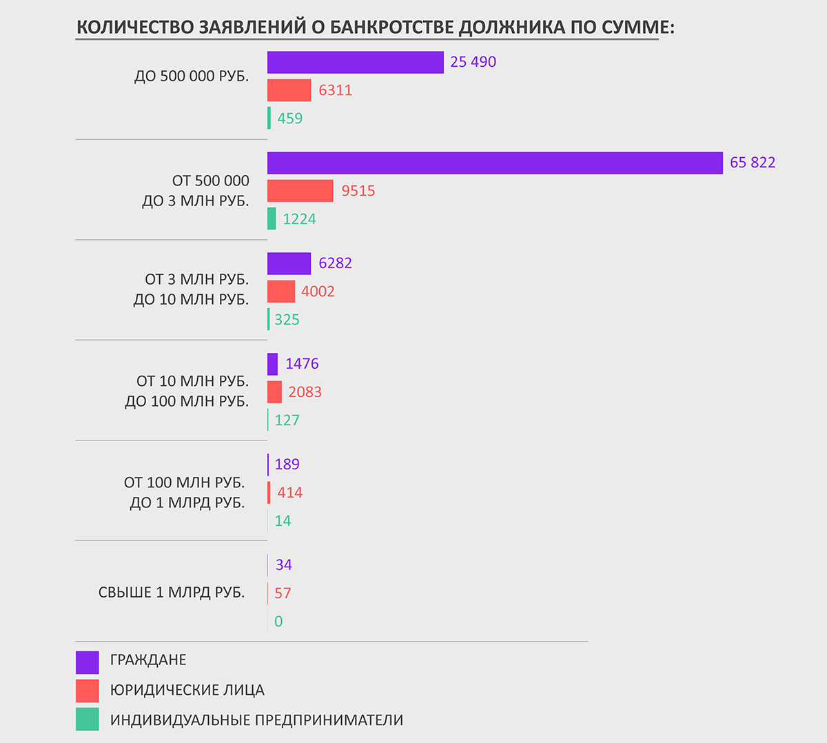 За шесть месяцев было принято решение о признании должника банкротом в отношении 87 627 граждан, завершена процедура конкурсного производства, реструктуризации долга или реализации имущества в отношении 58 395 человек.