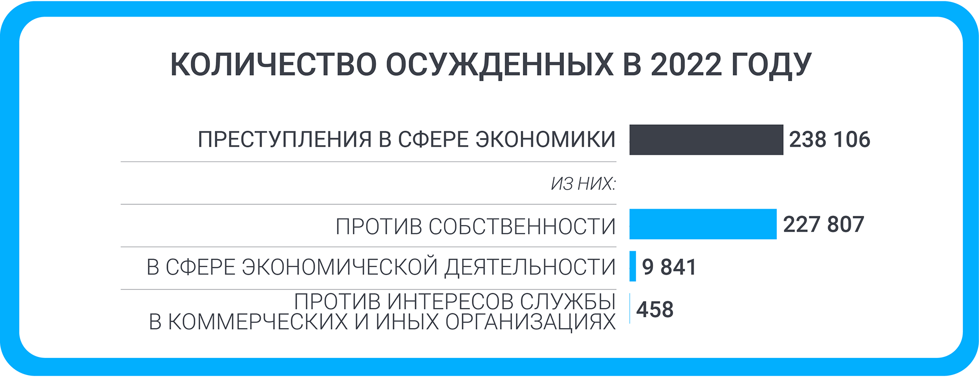 Выяснилось, что чаще всего наказывали за преступления против собственности: кражи и мошенничества. Меньше всего осужденных за преступления против интересов службы в коммерческих и иных организациях.