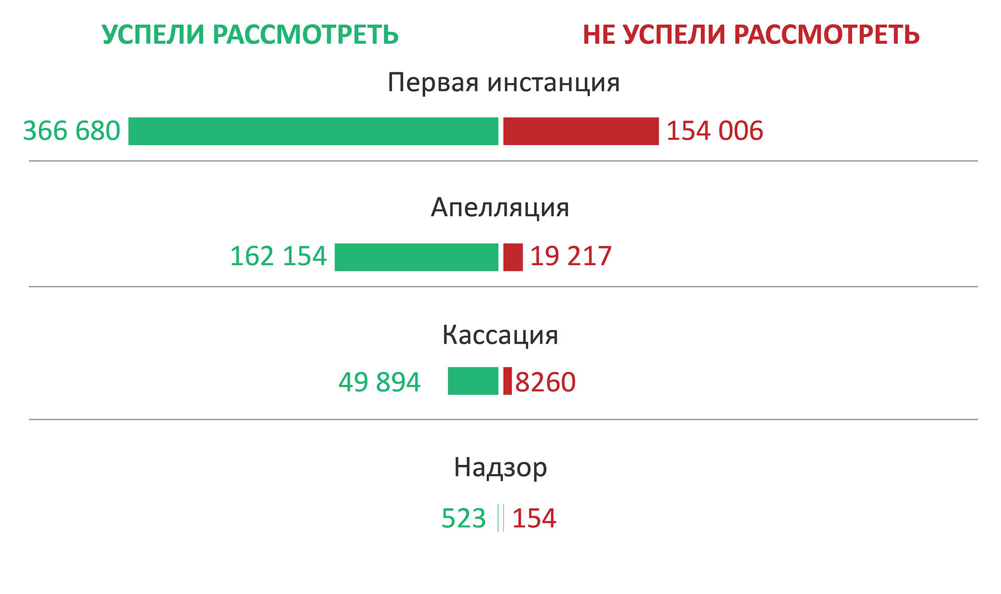 Суды кассационной инстанции рассмотрели 49 894 жалобы и представления, отменив 1235 обвинительных приговоров первой инстанции и 856 — апелляционной, а также изменили 2035 и 1454 приговора соответственно. 54 приговора были отменены. В порядке надзора за полгода рассмотрены 523 дела. По ним удовлетворены 35 жалоб и три представления, отменены четыре и изменены три обвинительных приговора.