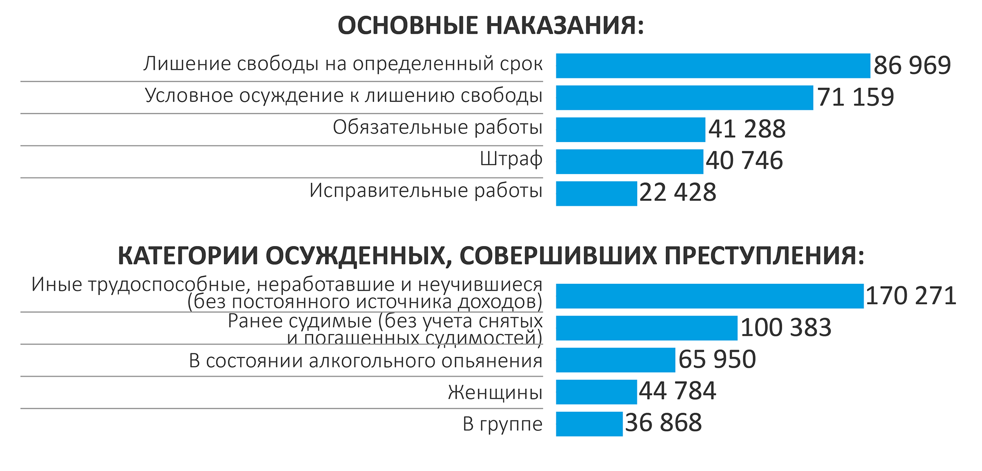 Самыми распространенными преступлениями стали кража (79 376 осужденных), незаконные действия с наркотиками (38 314) и нарушение правил безопасности движения и эксплуатации транспорта (30 223). Чаще всего суды назначали в качестве наказания лишение свободы, а также активно приговаривали подсудимых к условному осуждению к лишению свободы, обязательным работам и штрафам.