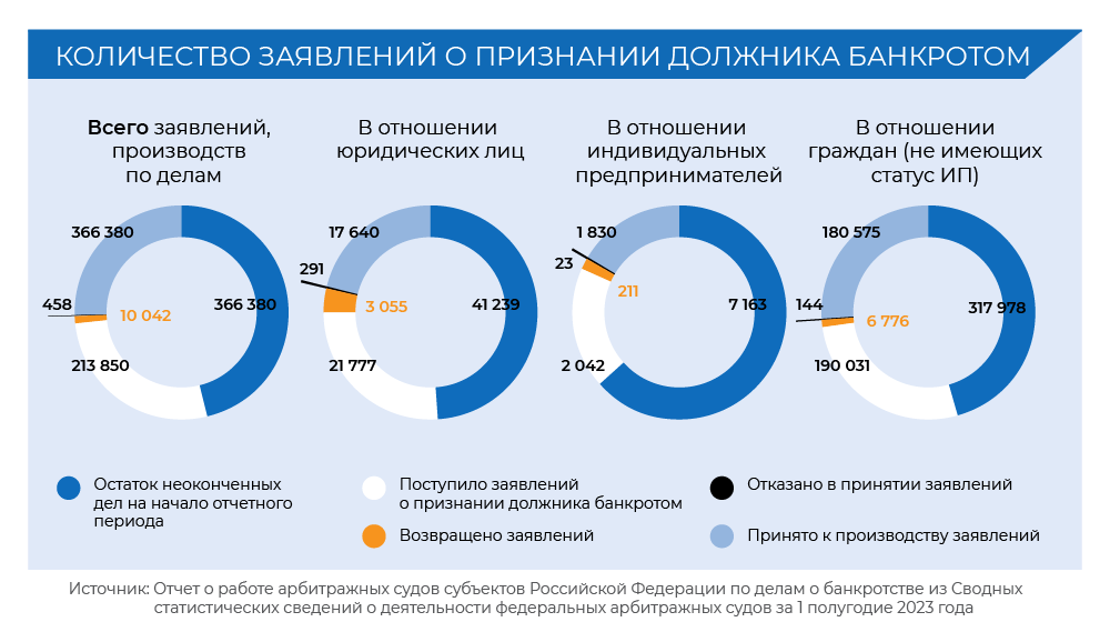 За шесть месяцев арбитражные суды ввели наблюдение в 3760 случаев, финансовое оздоровление — в 4, внешнее управление — в 32, конкурсное производство — в 3278, реструктуризацию долга — в 24 210, реализацию имущества — в 164 818.