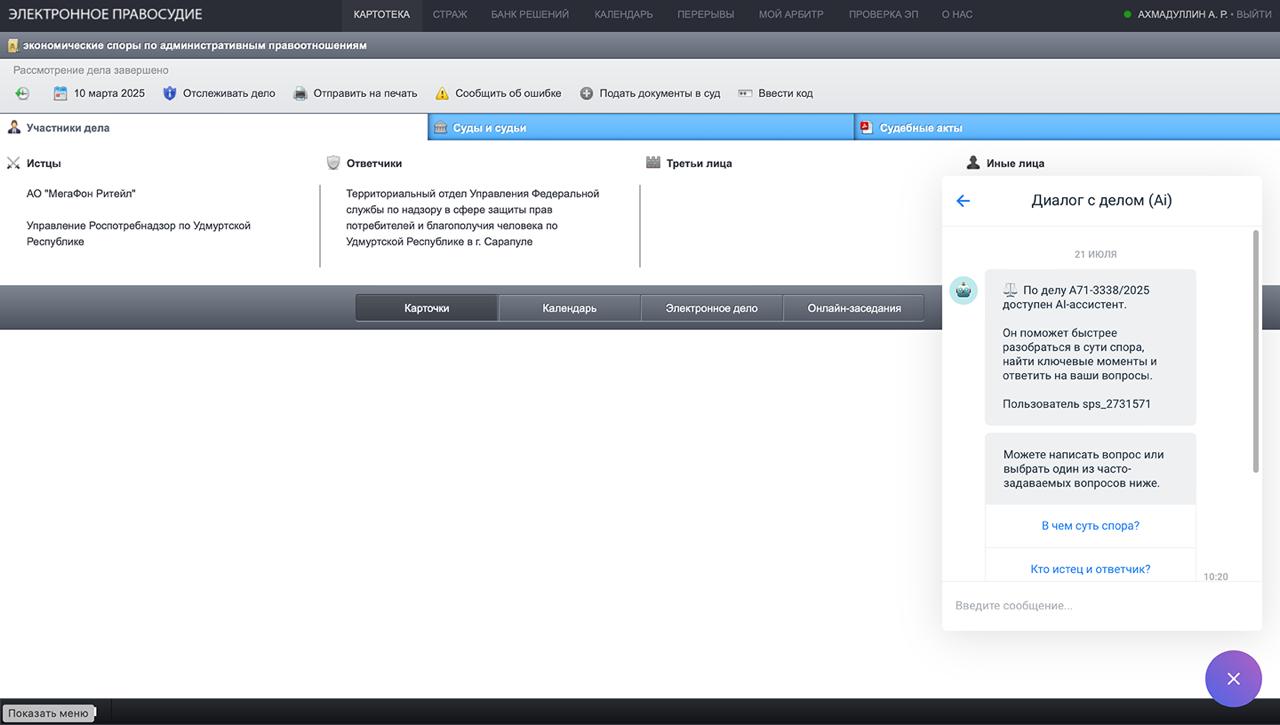 До конца августа в КАД появится ИИ-помощник «ПравоДиалог». У него можно будет спросить: «В чем суть спора?», «Какие события произошли недавно?» или «Каковы перспективы дела?» ИИ анализирует судебные акты и дает ответ прямо в интерфейсе КАД — не нужно переходить в другие решения и дополнительно регистрироваться. Виджет будет доступен только авторизованным пользователям, которые дали согласие на обработку данных. ИИ-помощник сможет анализировать все дела, кроме банкротных.