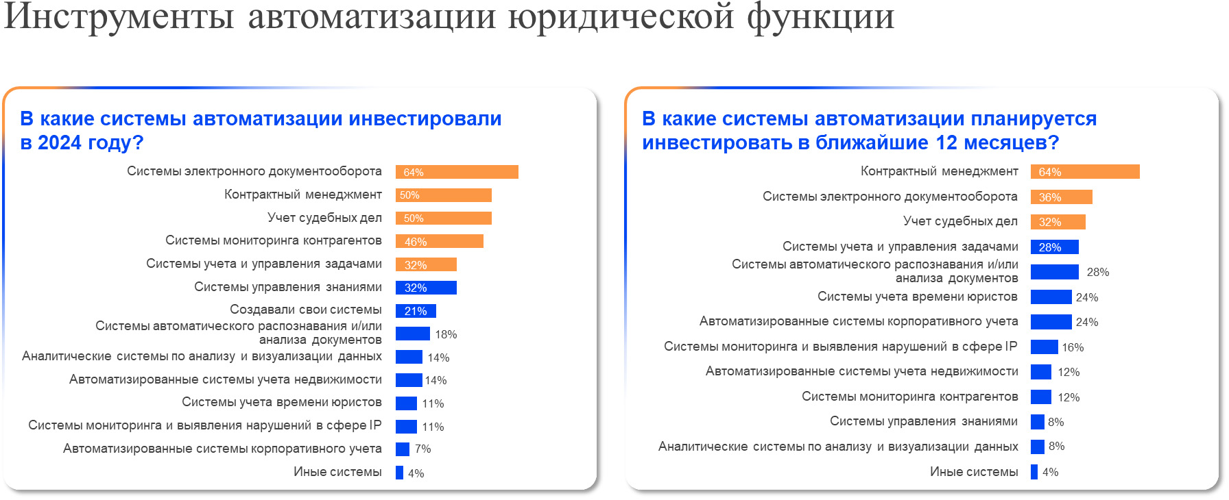 Лидерами среди направлений автоматизации остаются системы электронного документооборота, контрактный менеджмент и учет судебных дел. Также, судя по результатам опроса, компании готовы инвестировать в системы учета и управления задачами, автоматического распознавания и анализа документов, учета времени юристов и в автоматизированные системы корпоративного учета.