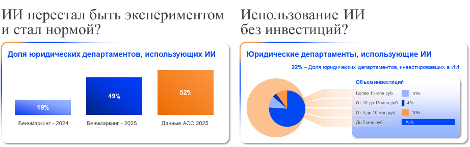 Искусственный интеллект: первые шаги. Объем использования ИИ-инструментов вырос почти вдвое (до 49%). Однако применение пока остается несистемным: юристы преимущественно опираются на общедоступные решения, а интеграция ИИ-инструментов в операционные процессы только начинается. ИИ используется юристами в основном для помощи при консультировании бизнеса, в судебной работе, в работе с договорами. При этом лишь 22% департаментов инвестировали в ИИ, и в большинстве случаев бюджеты не превышали 5 млн руб.