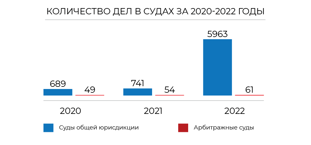 Для начала напомню статистику по групповым искам последних лет. Согласно данным Судебного департамента при Верховном суде, за 2020 год арбитражные суды рассмотрели 49 групповых исков, в 2021 году — 54, в 2022-м — 61. Суды общей юрисдикции в порядке гражданского судопроизводства в 2020-м рассмотрели 689 групповых исков, в 2021-м — 741, а в 2022-м — 5963. О взрывном росте количества групповых исков в СОЮ за прошлый год я писал отдельную колонку.