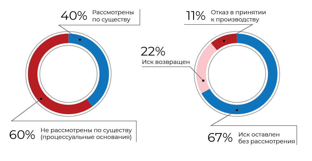 Часть групповых исков так и не стала предметом судебного рассмотрения по существу заявленных требований, не пройдя процессуальный барьер принятия иска или сертификации группы. Происходило это по разным причинам: отказ в принятии, возвращение или оставление исков без рассмотрения.