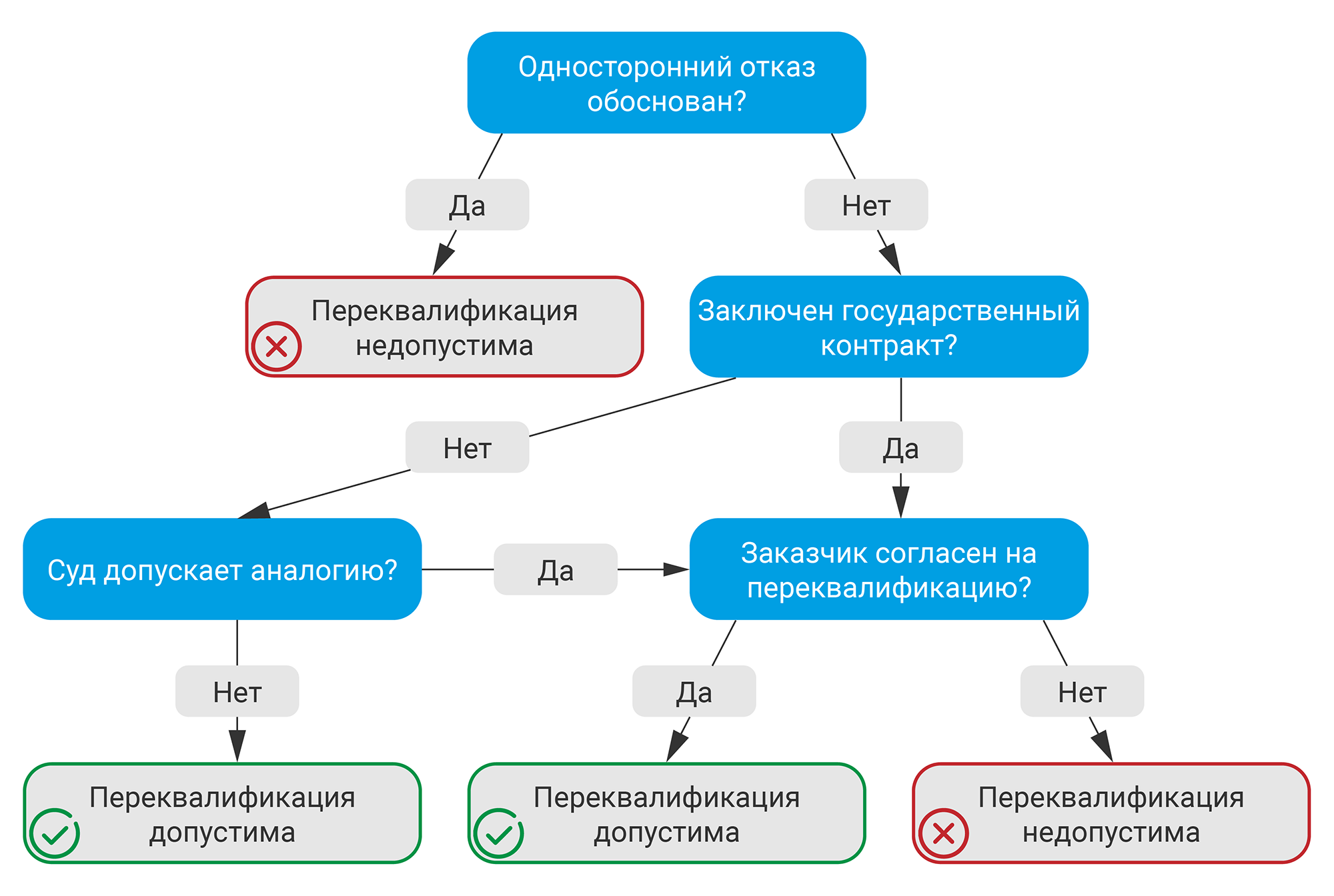 При переквалификации одностороннего отказа государственного заказчика необходимым условием будет согласие заказчика на такую переквалификацию (п. 27 обзора судебной практики ВС № 4 (2018), утвержденного Президиумом Верховного суда 26 декабря 2018 года).