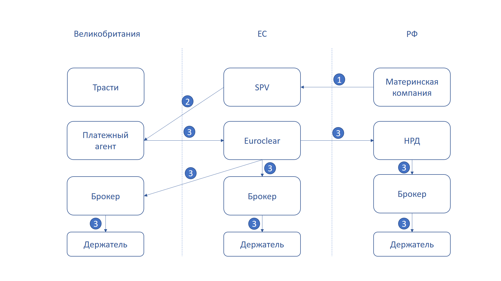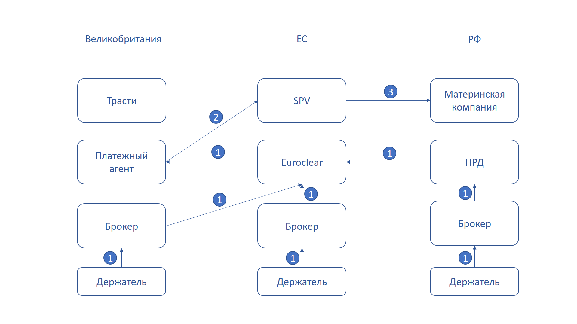 Если описывать упрощенно, учет прав на еврооблигации вели европейские регистраторы и различные номинальные держатели, в конце цепочки стоял бельгийский депозитарий Euroclear. Российские держатели обычно приобретали еврооблигации через российских брокеров, у которых были открыты счета в Национальном расчетном депозитарии (НРД), а он в свою очередь имел счета в Euroclear. Но некоторые россияне, руководствуясь соображениями безопасности (как она представлялась на тот момент) и конфиденциальности, приобретали еврооблигации напрямую в инфраструктуре ЕС, не задействуя НРД и иных российских депозитариев. Зачастую такие покупки оформлялись через офшорные компании на Кипре и Британских Виргинских Островах. Эта категория россиян оказалась в самом уязвимом положении под санкциями.