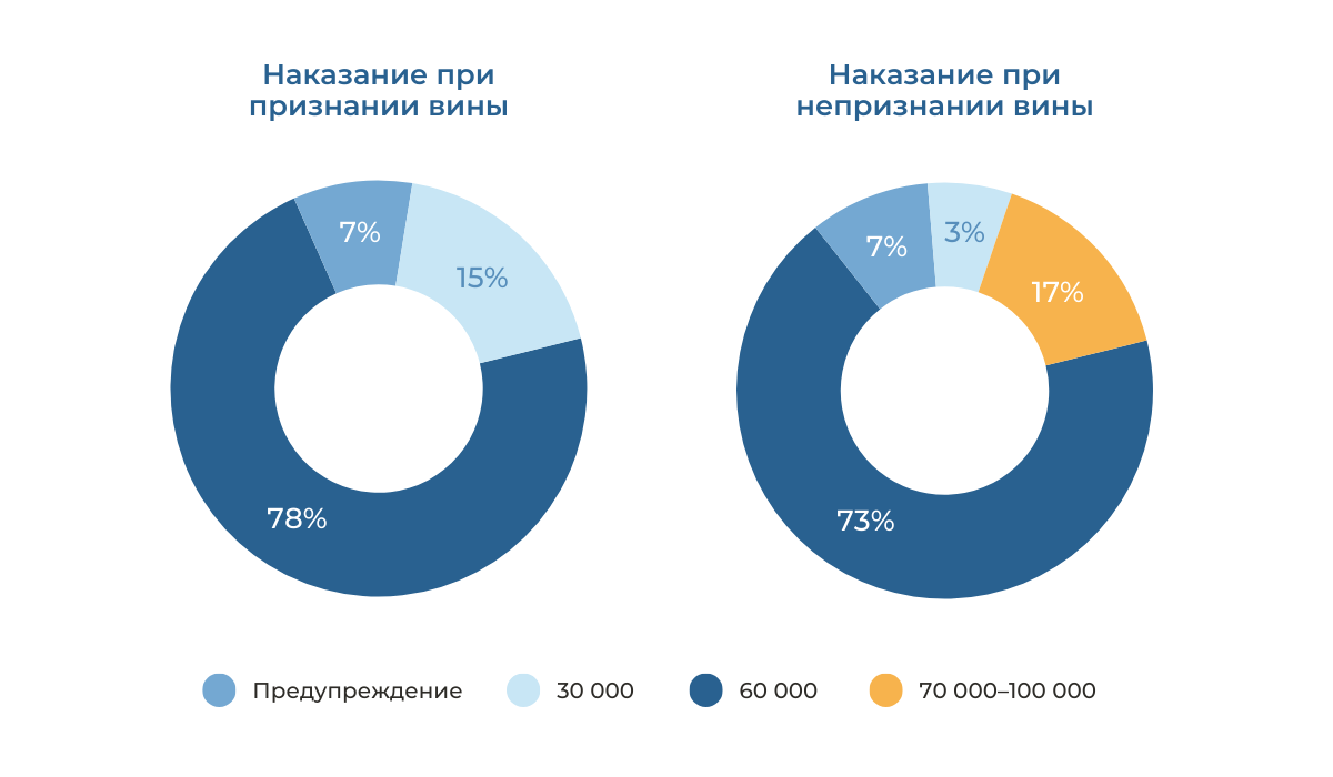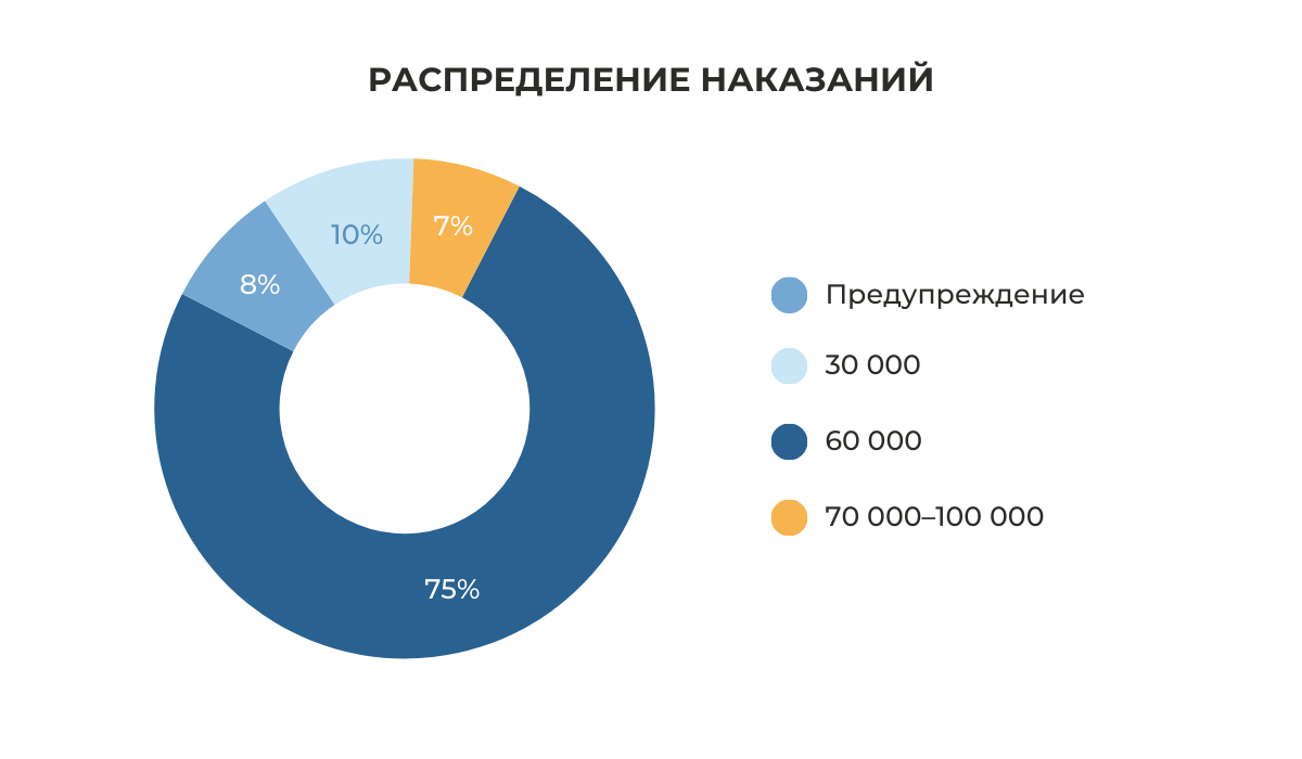 В 75% случаев суды назначают минимальное наказание (60 000 руб.), в 10% случаев — даже ниже низшего предела (30 000 руб.), а в 7% случаев только предупреждают нарушителя. Наказание в размере выше минимального, то есть 70 000–100 000 руб., суды сейчас назначают крайне редко — лишь в 7% случаев.