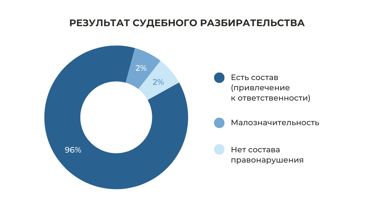 Признание операторами вины, сравнительно низкий размер штрафа, частое назначение минимального штрафа привели к формированию парадигмы, что если уполномоченный орган возбуждает такое дело, то оператор — правонарушитель. И чтобы опровергнуть это, операторы должны приложить несоразмерные сумме возможного штрафа усилия, что нерационально как минимум экономически. От этого и дела сопровождаются операторами вполноги. Итог для операторов удручающий: в 96% они проигрывают такие споры.