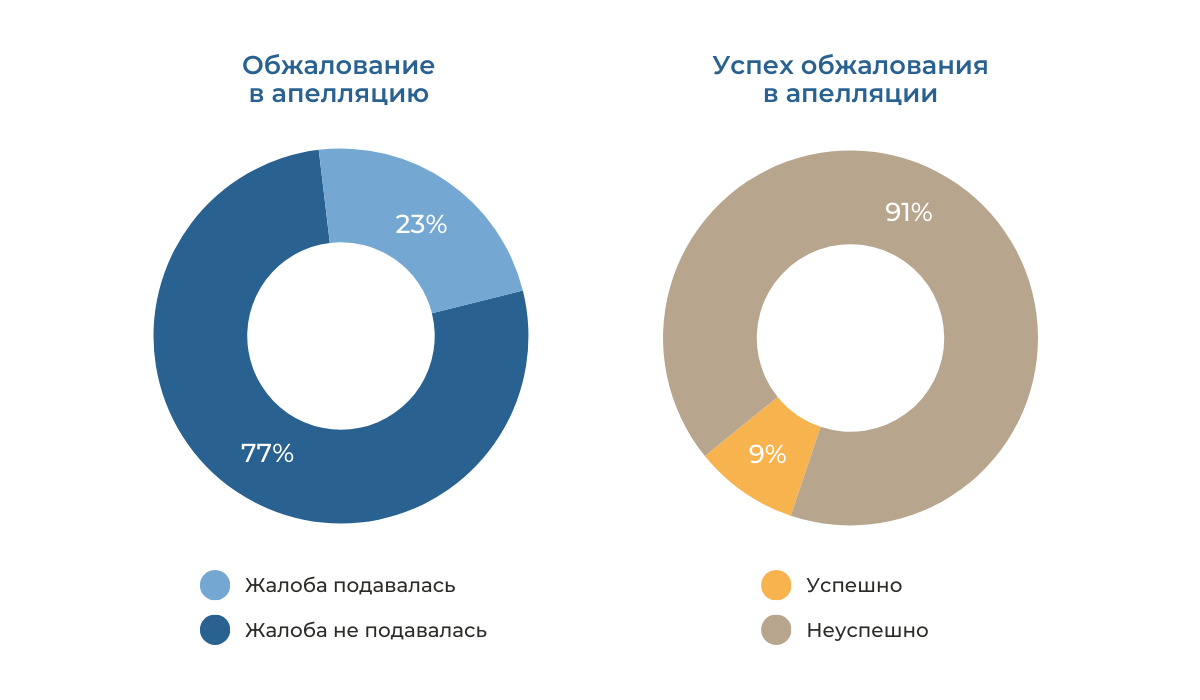 23% постановлений о привлечении к административной ответственности были обжалованы операторами в апелляцию (районный суд). Но только 9% апелляционных жалоб были полностью или частично удовлетворены.