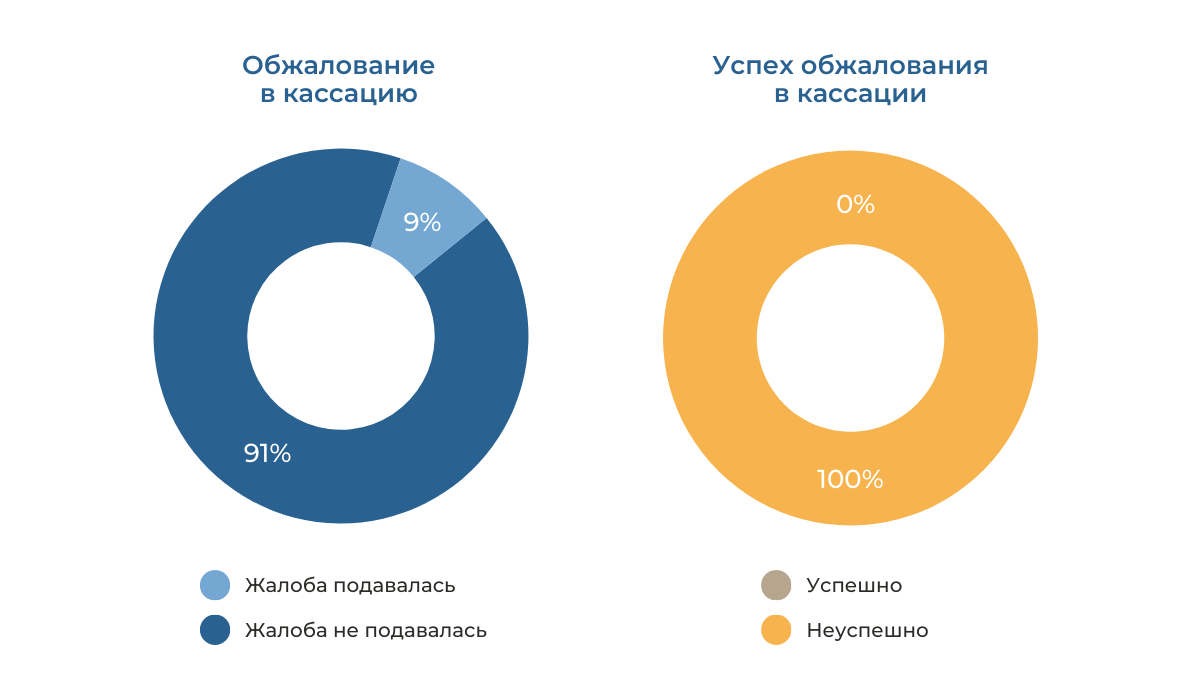 9% постановлений о привлечении к административной ответственности были обжалованы операторами в кассационный суд. Но в нашей выборке нет ни одного дела, где бы оператору удалось отменить постановление о привлечении к ответственности в суде кассационной инстанции.