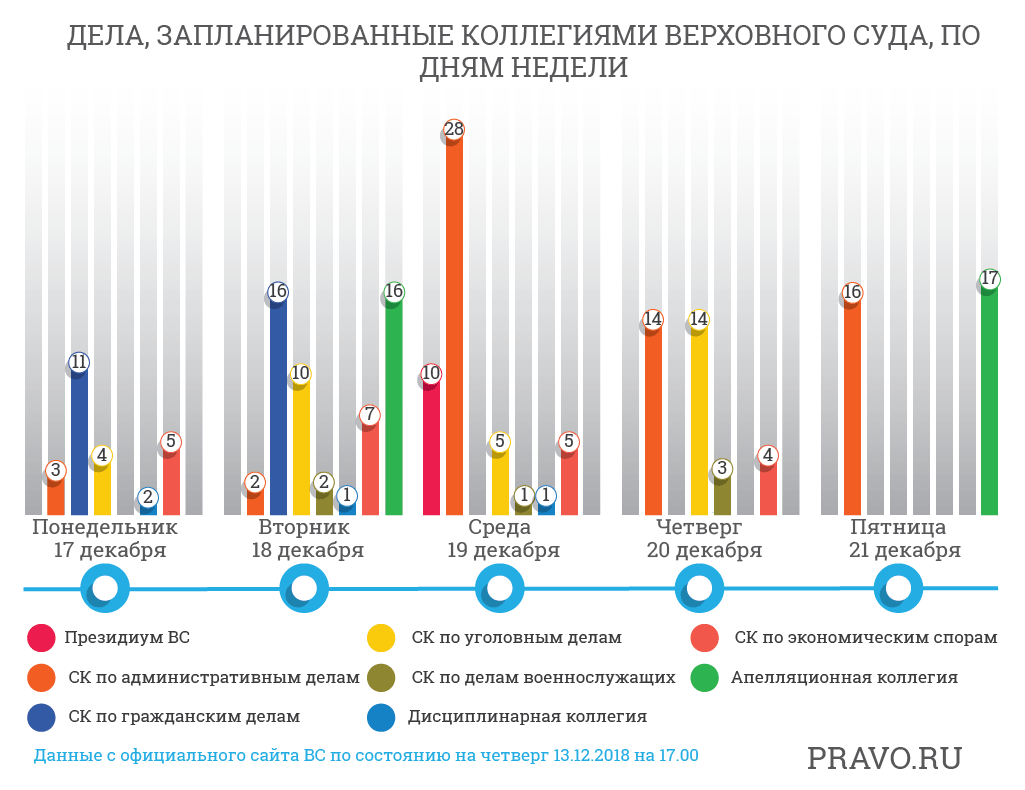 В гражданской коллегии должно состояться 27 дел. Экономколлегия рассмотрит 21 спор, среди которых: