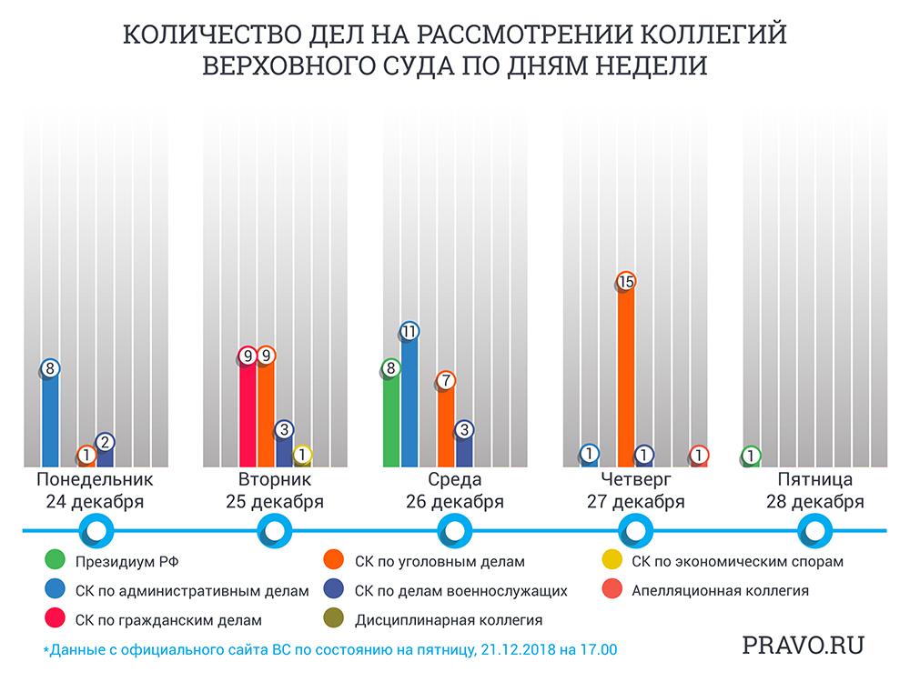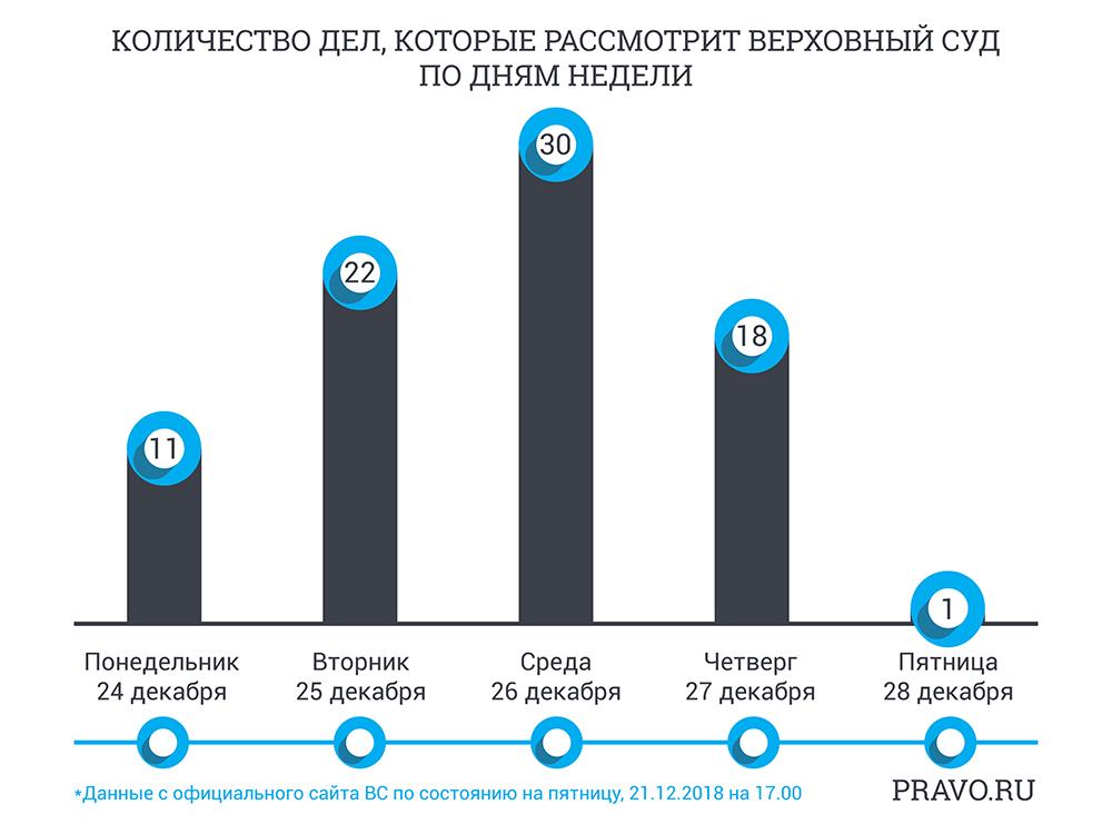 В последнюю неделю уходящего года в Верховном суде рассмотрят 81 дело. Суд пересмотрит дело после разбирательства в Конституционном суде, изучит дисциплинарный спор судьи, лишенного полномочий, по мнению заявителя, из-за интриг и предубеждения, и разберется в регистрации договора дарения. В Президиуме ВС впервые за два года рассмотрят экономический спор.