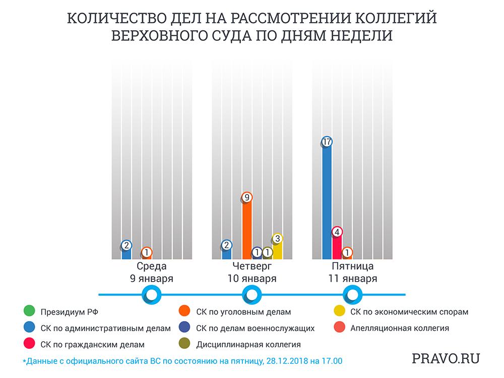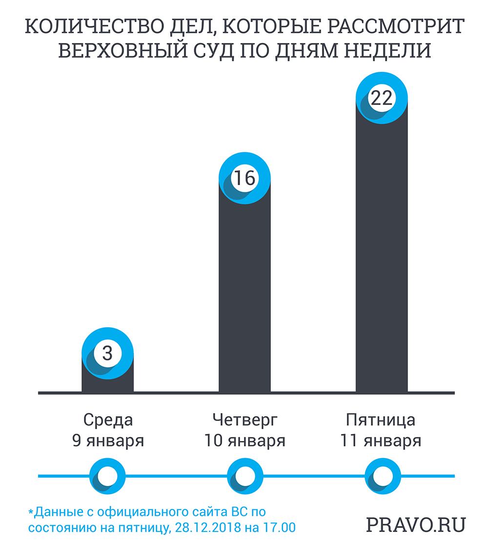 В первую рабочую неделю 2019 года Верховный суд планирует рассмотреть 41 дело. В их числе - дело боевика из банды Шамиля Басаева, спор судьи из Наро-Фоминска из-за досрочного прекращения полномочий и разбирательство между ООО "Агроторг" и антимонопольной службой из-за "лишней" арендованной площади магазинов "Пятерочка".