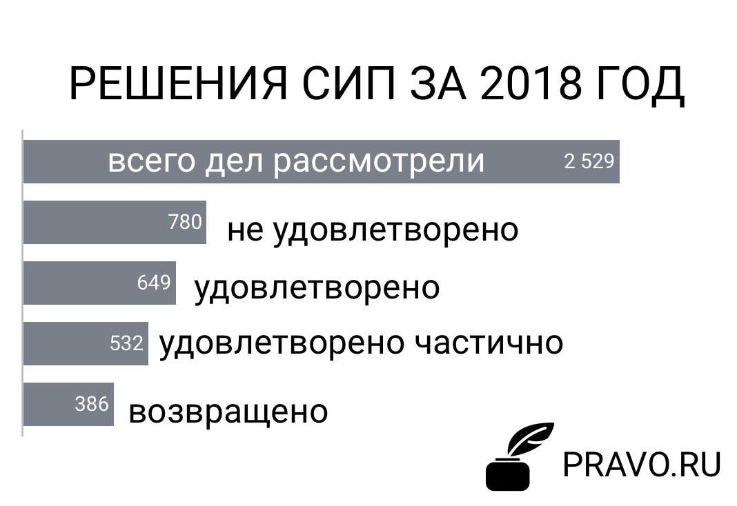 Через суд по интеллектуальным правам проходит сравнительно немного дел: всего в производстве суда находится 1 064 дел, самое старое из которых длится больше четырех тысяч дней. В 2017 году в СИП подали 1 660 исковых заявлений, а в 2018 их подали на 36% меньше — 1055.